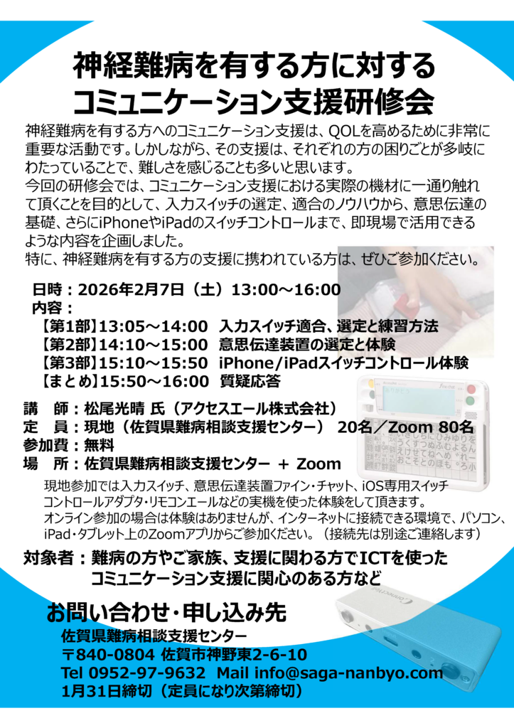 神経難病を有する方へのコミュニケーション支援は、QOLを高めるために非常に 重要な活動です。しかしながら、その支援は、それぞれの方の困りごとが多岐に わたっていることで、難しさを感じることも多いと思います。 今回の研修会では、コミュニケーション支援における実際の機材に一通り触れ て頂くことを目的として、入力スイッチの選定、適合のノウハウから、意思伝達の 基礎、さらにiPhoneやiPadのスイッチコントロールまで、即現場で活用できる ような内容を企画しました。 特に、神経難病を有する方の支援に携われている方は、ぜひご参加ください。