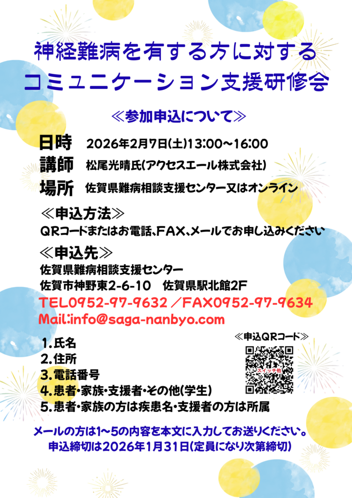 定員:現地(佐賀県難病相談支援センター) 20名/Zoom 80名